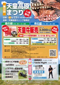 第32回天童高原まつりを開催いたします。 【日時】:令和6年8月24日(土)・25日(日) 【時間】:午前10時から午後2時30分まで 【場所】:天童高原キャンプ場特設会場 【申込方法】:電話での申し込み(産業立地室 023-654-1111) ※天童高原での申し込みはできません。 【問合せ】:天童高原まつり実行委員会(天童市経済部産業立地 ………