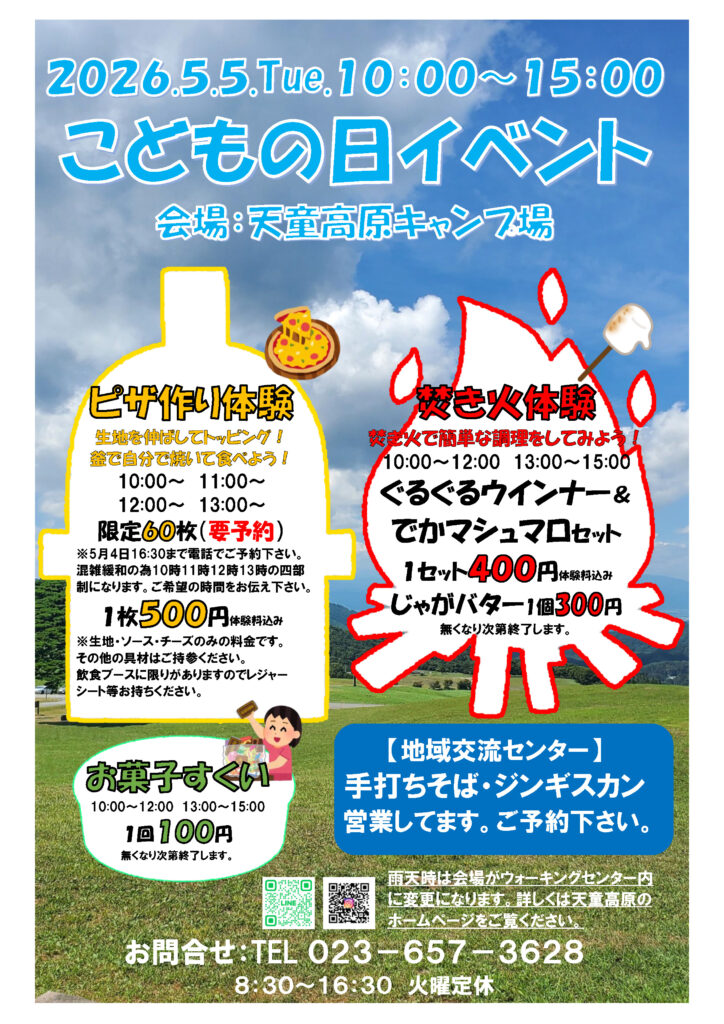 天童高原地域交流センター 定休日:火曜日 TEL:023-657-3628 8:00~16:30