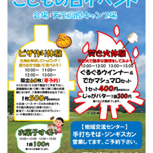 いつも天童高原をご利用いただきありがとうございます。 今年は、5月5日(火)こどもの日にイベントを開催しますので、ぜひ遊びに来てください。 ◆日時 2026年5月5日(火)こどもの日 10:00~15:00 ◆会場 天童高原キャンプ場 ◆イベント内容 ・ピザ作り体験 限定60枚(要予約) 1枚500円 生地、ソース、チー ………