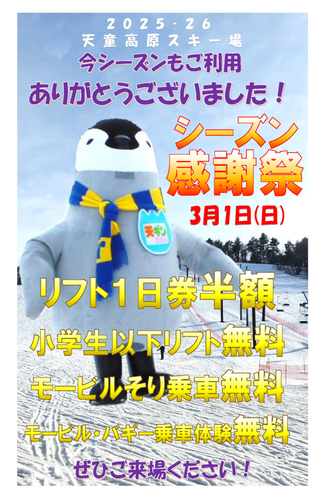 3/1(日)【2025-26天童高原スキー場シーズン感謝祭】開催!